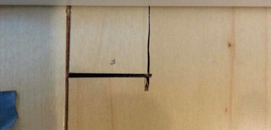 太田区のリフォーム現場にて。 木製ドアのパンチ穴。 交換ではなく部分補修をさせて