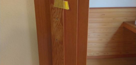 江戸川区のリフォーム現場にて。 鍵の金具を外した際のビス穴を補修させていただきま