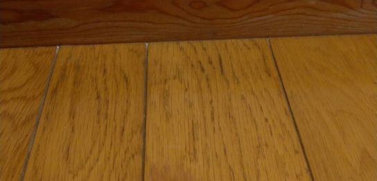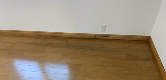 練馬区のリノベーション現場にて。 一部分黒ずみ劣化したフローリングと巾木 フロー